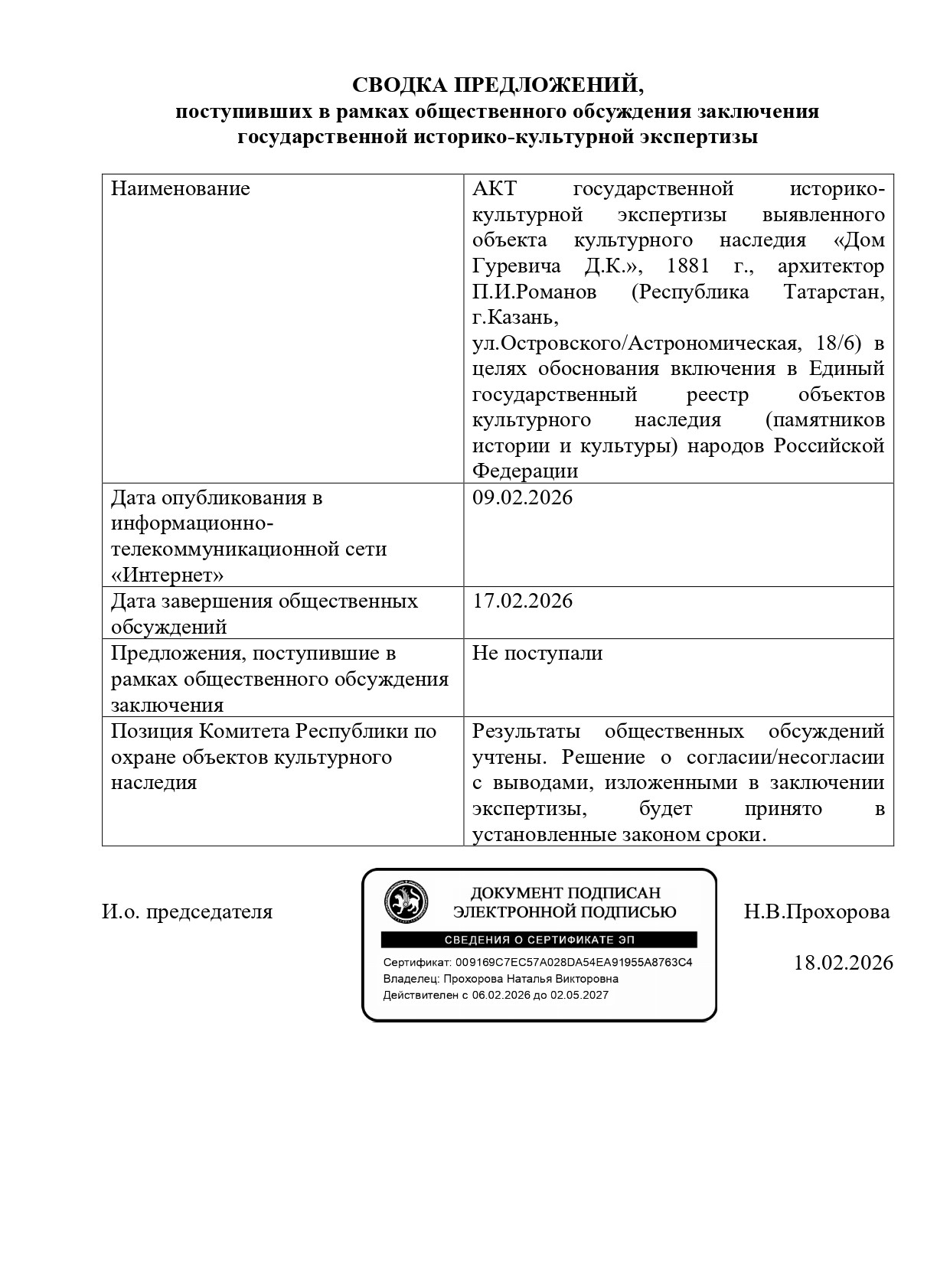 АКТ ГОСУДАРСТВЕННОЙ ИСТОРИКО-КУЛЬТУРНОЙ ЭКСПЕРТИЗЫ ВЫЯВЛЕННОГО ОБЪЕКТА КУЛЬТУРНОГО НАСЛЕДИЯ «ДОМ ГУРЕВИЧА Д.К.», 1881Г., АРХИТЕКТОР П.И. РОМАНОВ (РЕСПУБЛИКА ТАТАРСТАН, Г. КАЗАНЬ, УЛ. ОСТРОВСКОГО/АСТРОНОМИЧЕСКАЯ,18/6) В ЦЕЛЯХ ОБОСНОВАНИЯ ВКЛЮЧЕНИЯ В ЕДИНЫЙ ГОСУДАРСТВЕННЫЙ РЕЕСТР ОБЪЕКТОВ КУЛЬТУРНОГО НАСЛЕДИЯ (ПАМЯТНИКОВ ИСТОРИИ И КУЛЬТУРЫ) НАРОДОВ РОССИЙСКОЙ ФЕДЕРАЦИИ