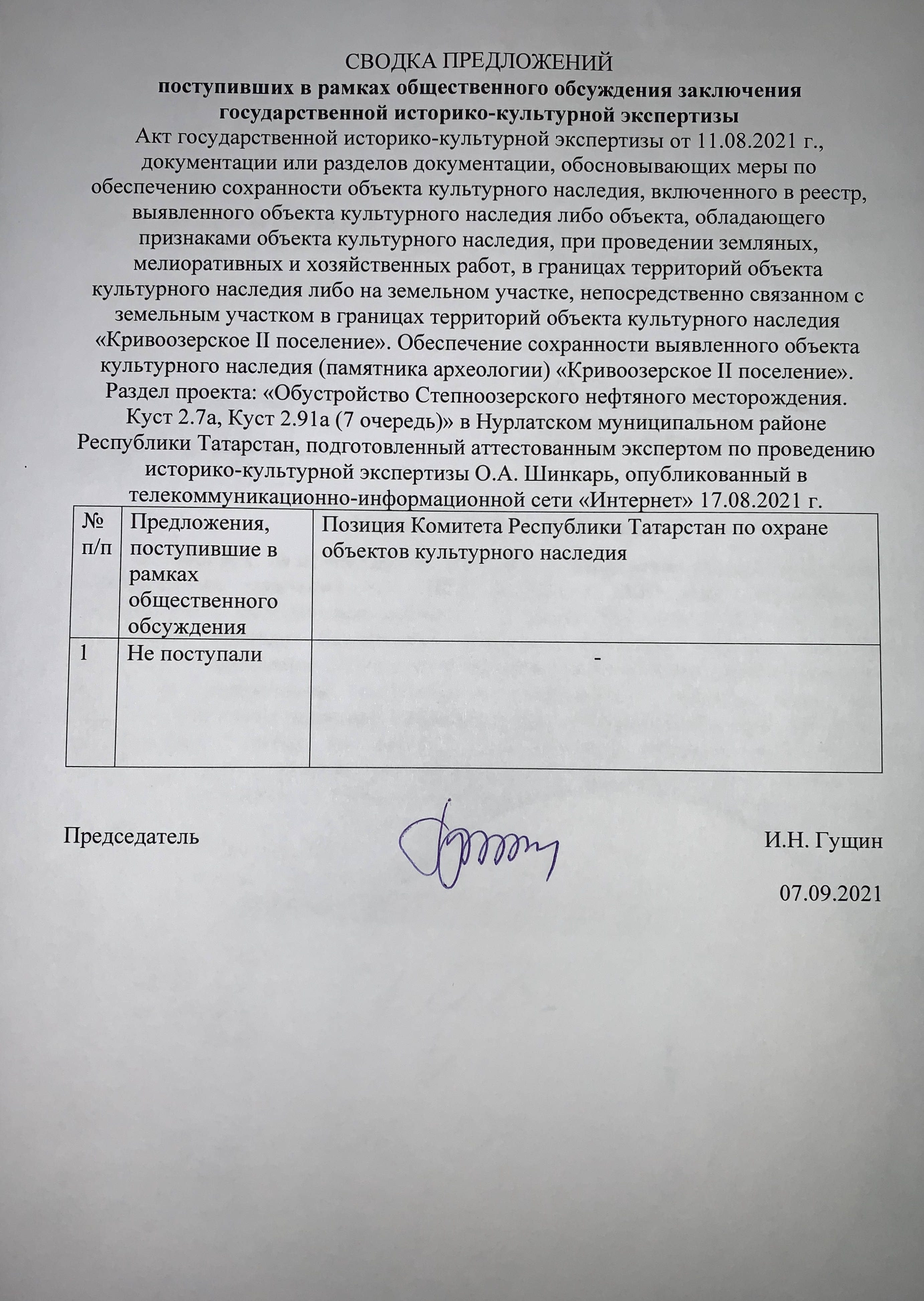 АКТ государственной историко-культурной экспертизы Документации, содержащей результаты исследования, в соответствии, с которыми определяется наличие или отсутствие объектов, обладающих признаками объекта культурного наследия, на земельном участке, подлежащем воздействию земляных, строительных, мелиоративных и (или) хозяйственных работ, отводимом под объект: Обустройство скважин Кузайкинского месторождения К-524/3, К-526/2, 15186, 15186/2, 15186/3" в Альметьевском муниципальном районе Республики Татарстан