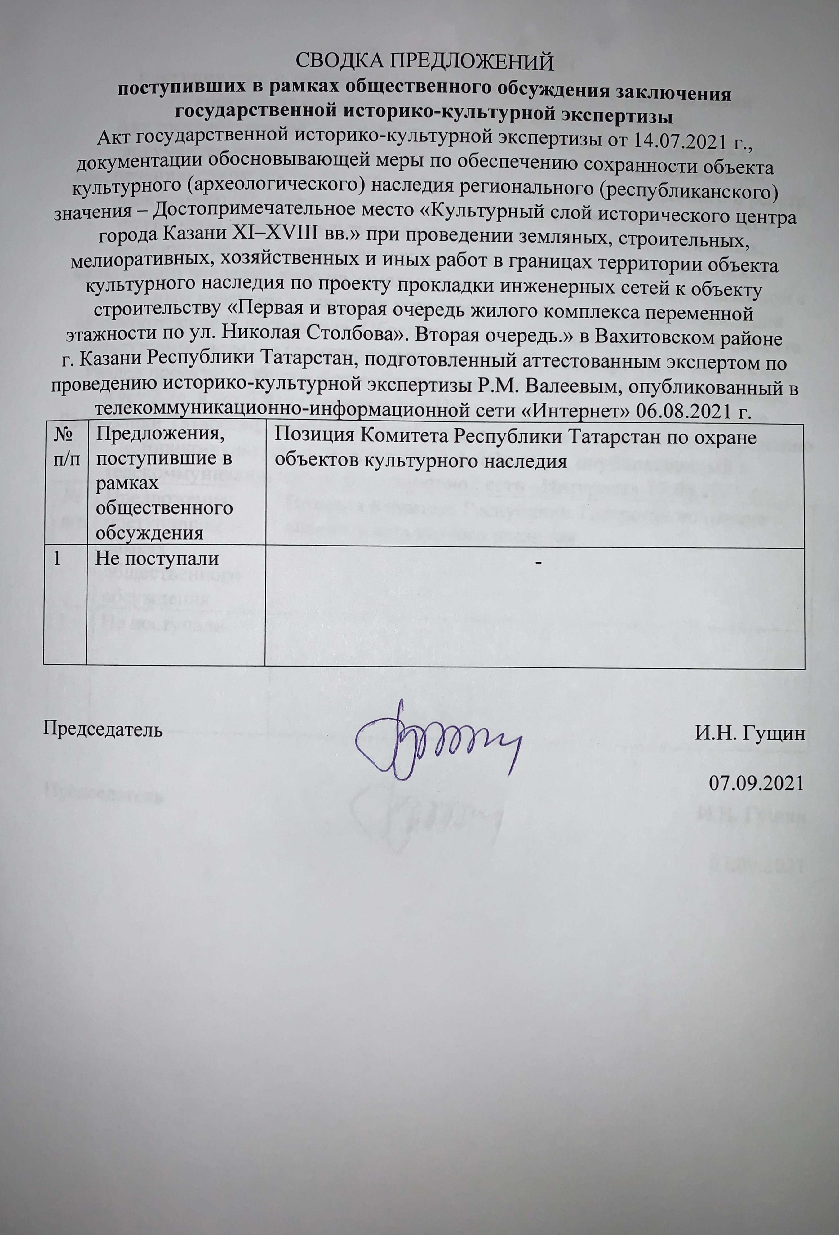 Акт государственной историко-культурной экспертизы документации, обосновывающей меры по обеспечению сохранности объекта культурного (археологического) наследия регионального (республиканского) значения – Достопримечательное место «Культурный слой исторического центра города Казани XI–XVIII вв.» при проведении земляных, строительных, мелиоративных, хозяйственных и иных работ в границах территории объекта культурного наследия по проекту прокладки инженерных сетей к объекту строительству «Первая и вторая очередь жилого комплекса переменной этажности по ул. Николая Столбова». Вторая очередь.»