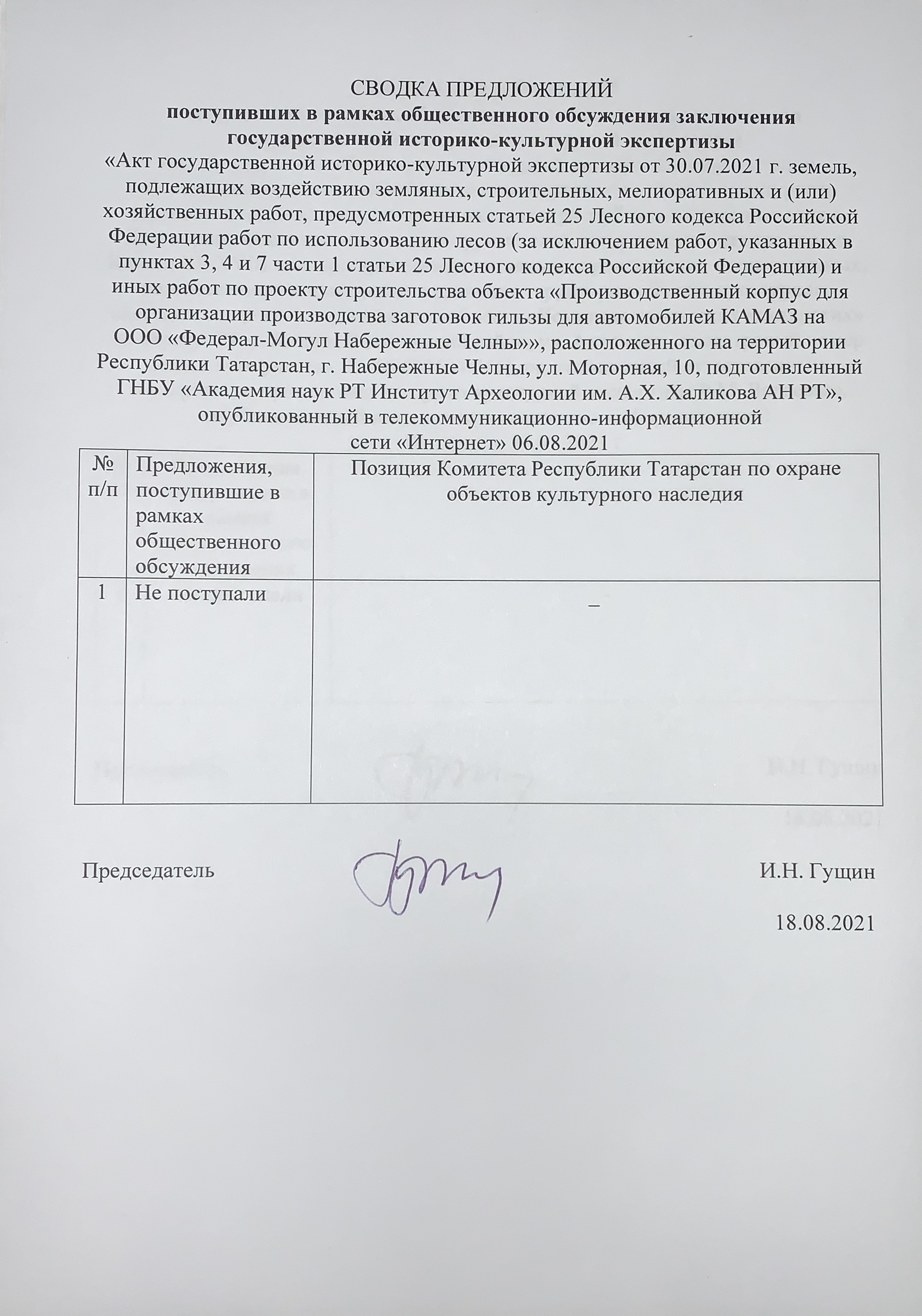 Акт государственной историко-культурной экспертизы земель, подлежащих воздействию земляных, строительных, мелиоративных и (или) хозяйственных работ, предусмотренных статьей 25 Лесного кодекса Российской Федерации работ по использованию лесов (за исключением работ, указанных в пунктах 3, 4 и 7 части 1 статьи 25 Лесного кодекса Российской Федерации) и иных работ по проекту строительства объекта «Производственный корпус для организации производства заготовок гильзы для автомобилей КАМАЗ на ООО «Федерал-Могул Набережные Челны»», расположенного на территории Республики Татарстан, г. Набережные Челны, ул. Моторная, 10