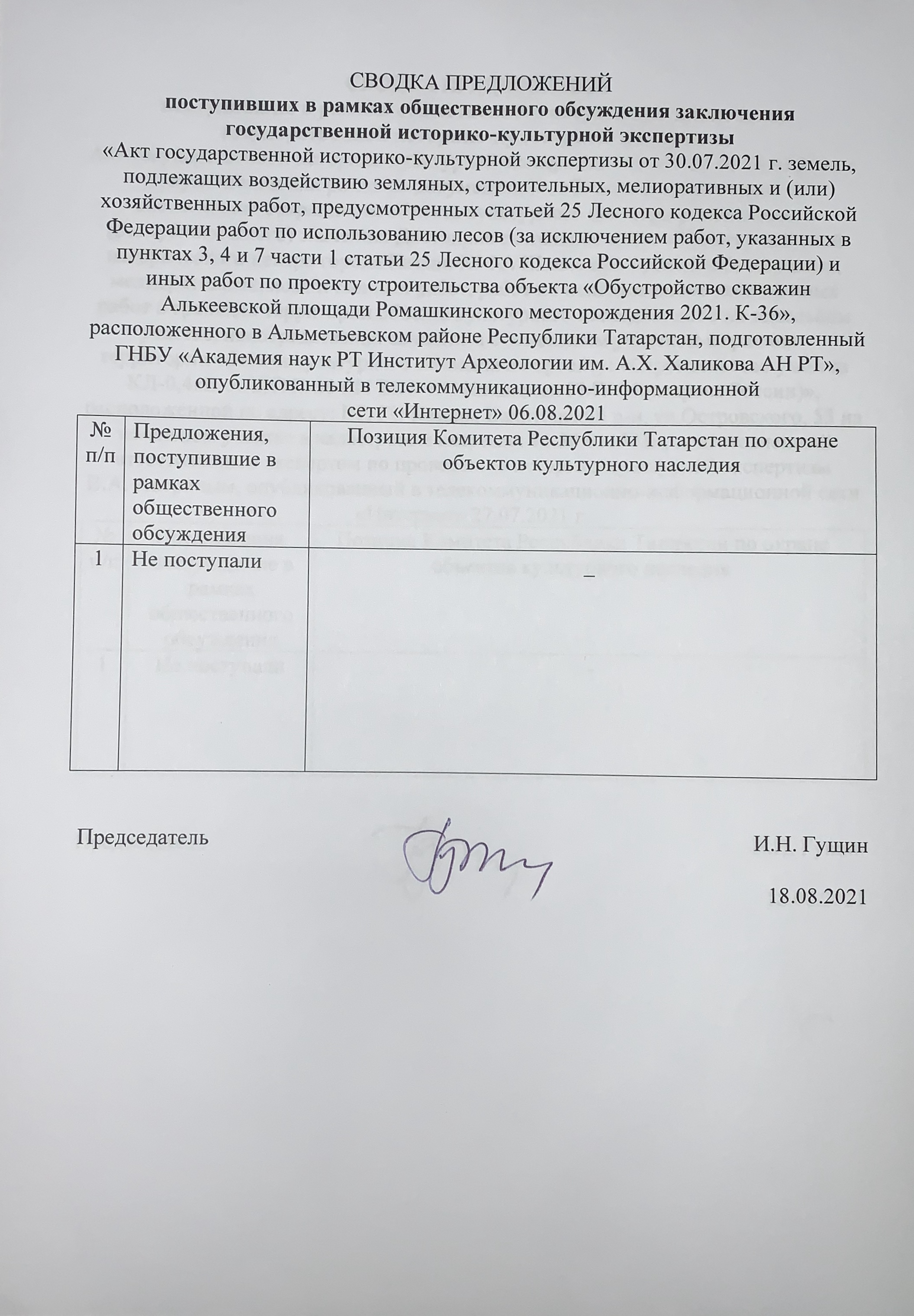 Акт государственной историко-культурной экспертизы земель, подлежащих воздействию земляных, строительных, мелиоративных и (или) хозяйственных работ, предусмотренных статьей 25 Лесного кодекса Российской Федерации работ по использованию лесов (за исключением работ, указанных в пунктах 3, 4 и 7 части 1 статьи 25 Лесного кодекса Российской Федерации) и иных работ по проекту строительства объекта «Обустройство скважин Алькеевской площади Ромашкинского месторождения 2021. К-36», расположенного в Альметьевском районе Республики Татарстан