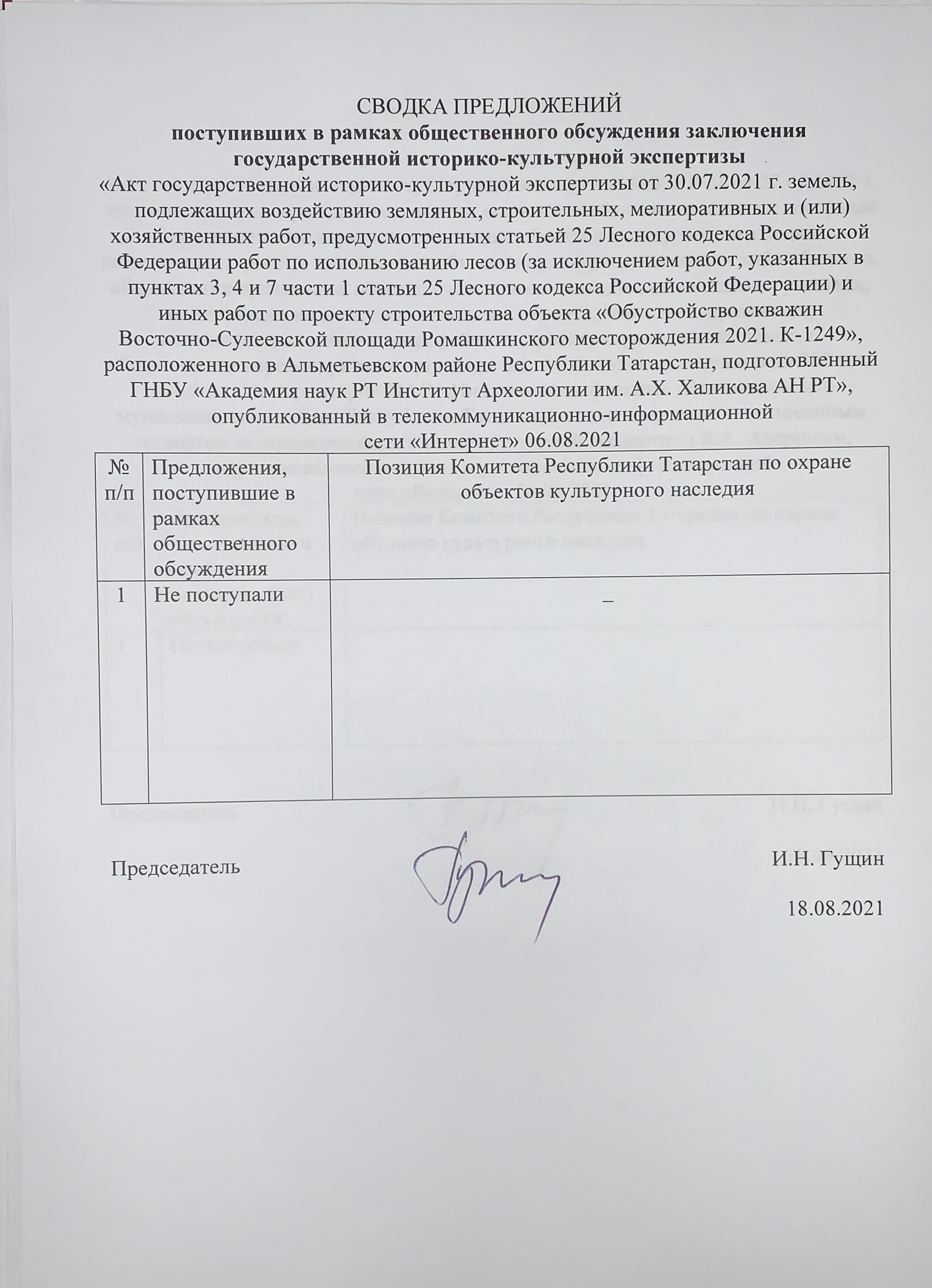 Акт государственной историко-культурной экспертизы земель, подлежащих воздействию земляных, строительных, мелиоративных и (или) хозяйственных работ, предусмотренных статьей 25 Лесного кодекса Российской Федерации работ по использованию лесов (за исключением работ, указанных в пунктах 3, 4 и 7 части 1 статьи 25 Лесного кодекса Российской Федерации) и иных работ по проекту строительства объекта «Обустройство скважин Восточно-Сулеевской площади Ромашкинского месторождения 2021. К-1249», расположенного в Альметьевском районе Республики Татарстан