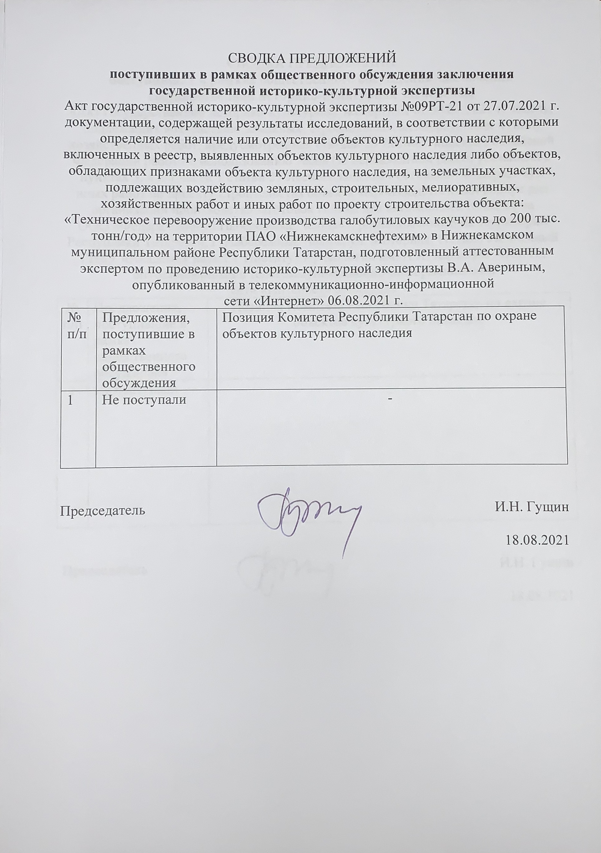 АКТ государственной историко-культурной экспертизы №09РТ-21 от 27.07.2021г. документации, содержащей результаты исследований, в соответствии с которыми определяется наличие или отсутствие объектов культурного наследия, включенных в реестр, выявленных объектов культурного наследия либо объектов, обладающих признаками объекта культурного наследия, на земельных участках, подлежащих воздействию земляных, строительных, мелиоративных, хозяйственных работ и иных работ по проекту строительства объекта: «Техническое перевооружение производства галобутиловых каучуков до 200 тыс. тонн/год» на территории ПАО «Нижнекамскнефтехим» в Нижнекамском муниципальном районе Республики Татарстан