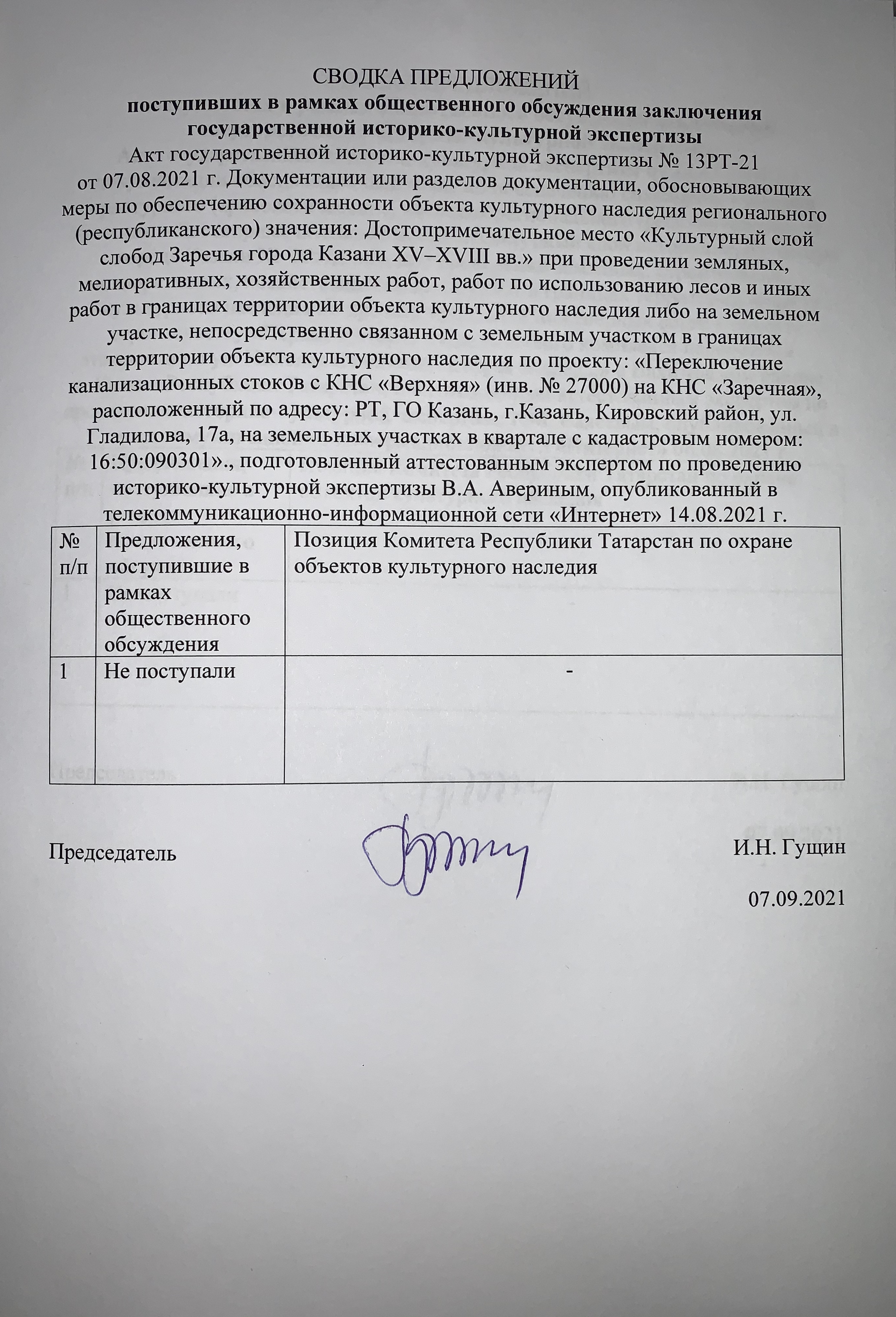 АКТ государственной историко-культурной экспертизы № 13РТ-21 от 07.08.2021 г. Документации или разделов документации, обосновывающих меры по обеспечению сохранности объекта культурного наследия регионального (республиканского) значения: Достопримечательное место «Культурный слой слобод Заречья города Казани XV–XVIII вв.» при проведении земляных, мелиоративных, хозяйственных работ, работ по использованию лесов и иных работ в границах территории объекта культурного наследия либо на земельном участке, непосредственно связанном с земельным участком в границах территории объекта культурного наследия по проекту: «Переключение канализационных стоков с КНС «Верхняя» (инв. № 27000) на КНС «Заречная», расположенный по адресу: РТ, ГО Казань, г.Казань, Кировский район, ул. Гладилова, 17а, на земельных участках в квартале с кадастровым номером: 16:50:090301»