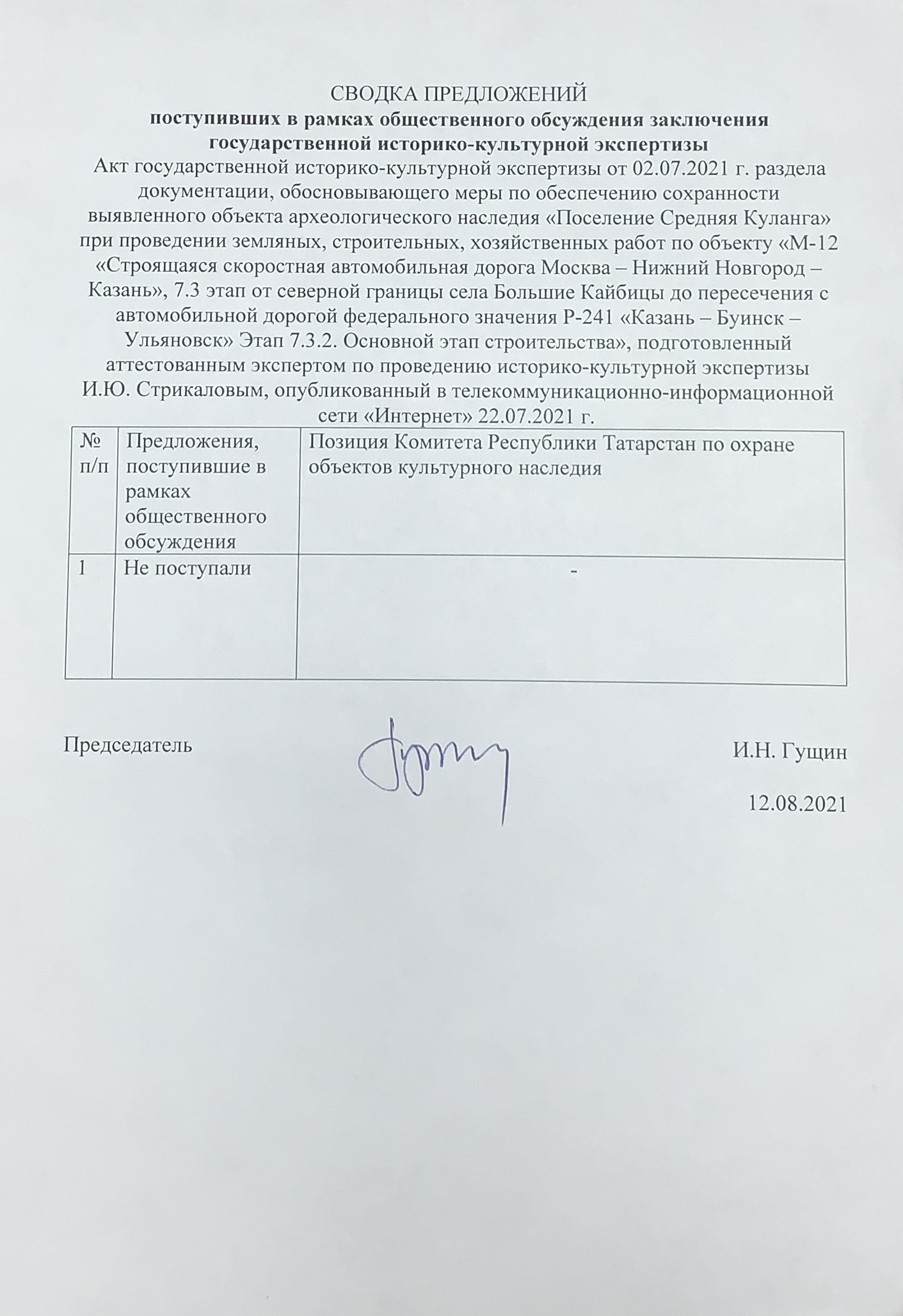 Акт государственной историко-культурной экспертизы раздела документации, обосновывающего меры по обеспечению сохранности выявленного объекта археологического наследия «Поселение Средняя Куланга» при проведении земляных, строительных, хозяйственных работ по объекту «М-12 «Строящаяся скоростная автомобильная дорога Москва – Нижний Новгород – Казань», 7.3 этап от северной границы села Большие Кайбицы до пересечения с автомобильной дорогой федерального значения Р-241 «Казань – Буинск – Ульяновск» Этап 7.3.2. Основной этап строительства»