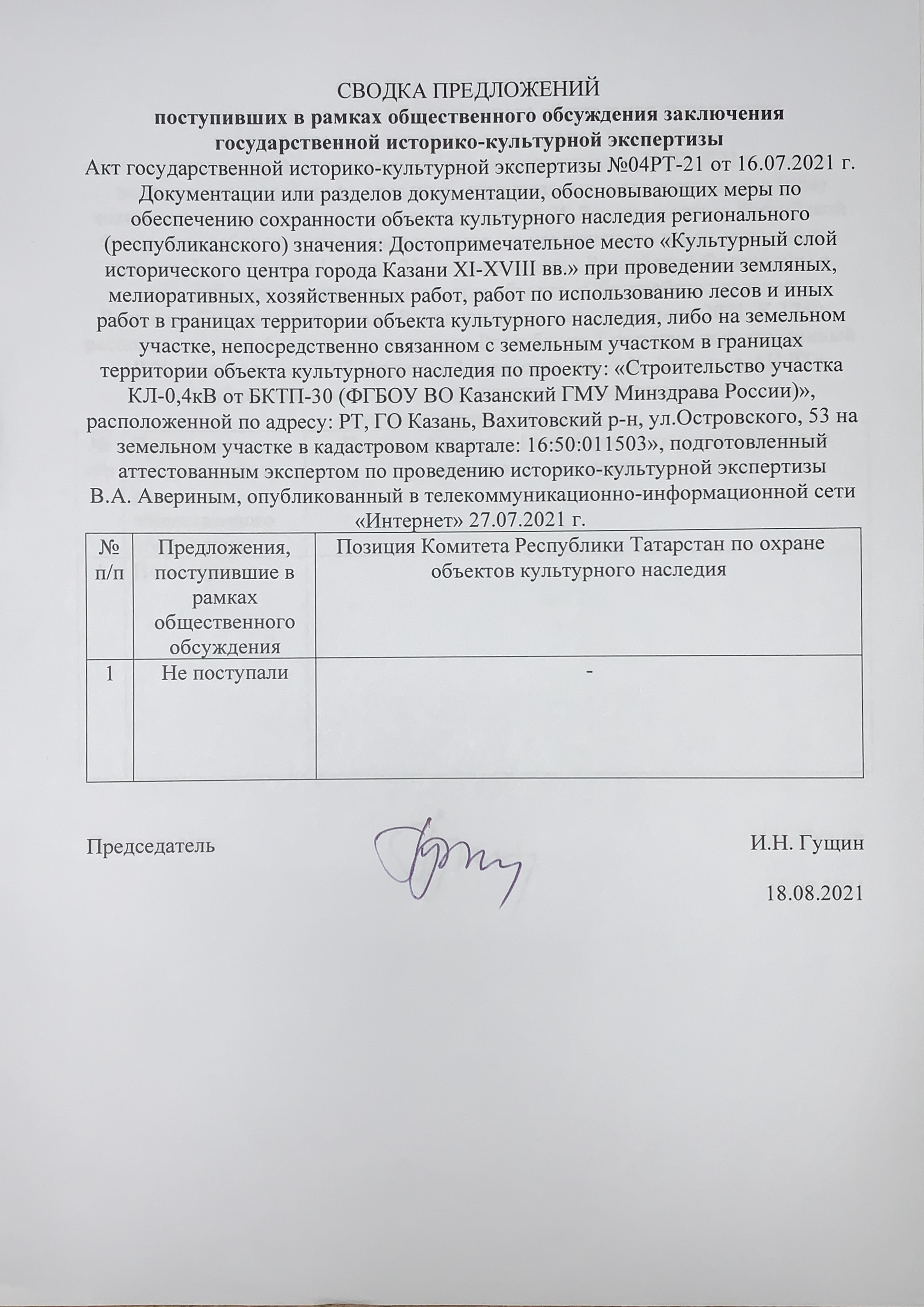 АКТ государственной историко-культурной экспертизы №04РТ-21 от 16. 07. 2021 г. Документации или разделов документации, обосновывающих меры по обеспечению сохранности объекта культурного наследия регионального (республиканского) значения: Достопримечательное место «Культурный слой исторического центра города Казани XI– XVIII вв.» при проведении земляных, мелиоративных, хозяйственных работ, работ по использованию лесов и иных работ в границах территории объекта культурного наследия, либо на земельном участке, непосредственно связанном с земельным участком в границах территории объекта культурного наследия по проекту: «Строительство участка КЛ-0,4кВ от БКТП-30 (ФГБОУ ВО Казанский ГМУ Минздрава России)», расположенной по адресу: РТ, ГО Казань, Вахитовский р-н , ул.Островского, 53 на земельном участке в кадастровом квартале: 16:50:011503»