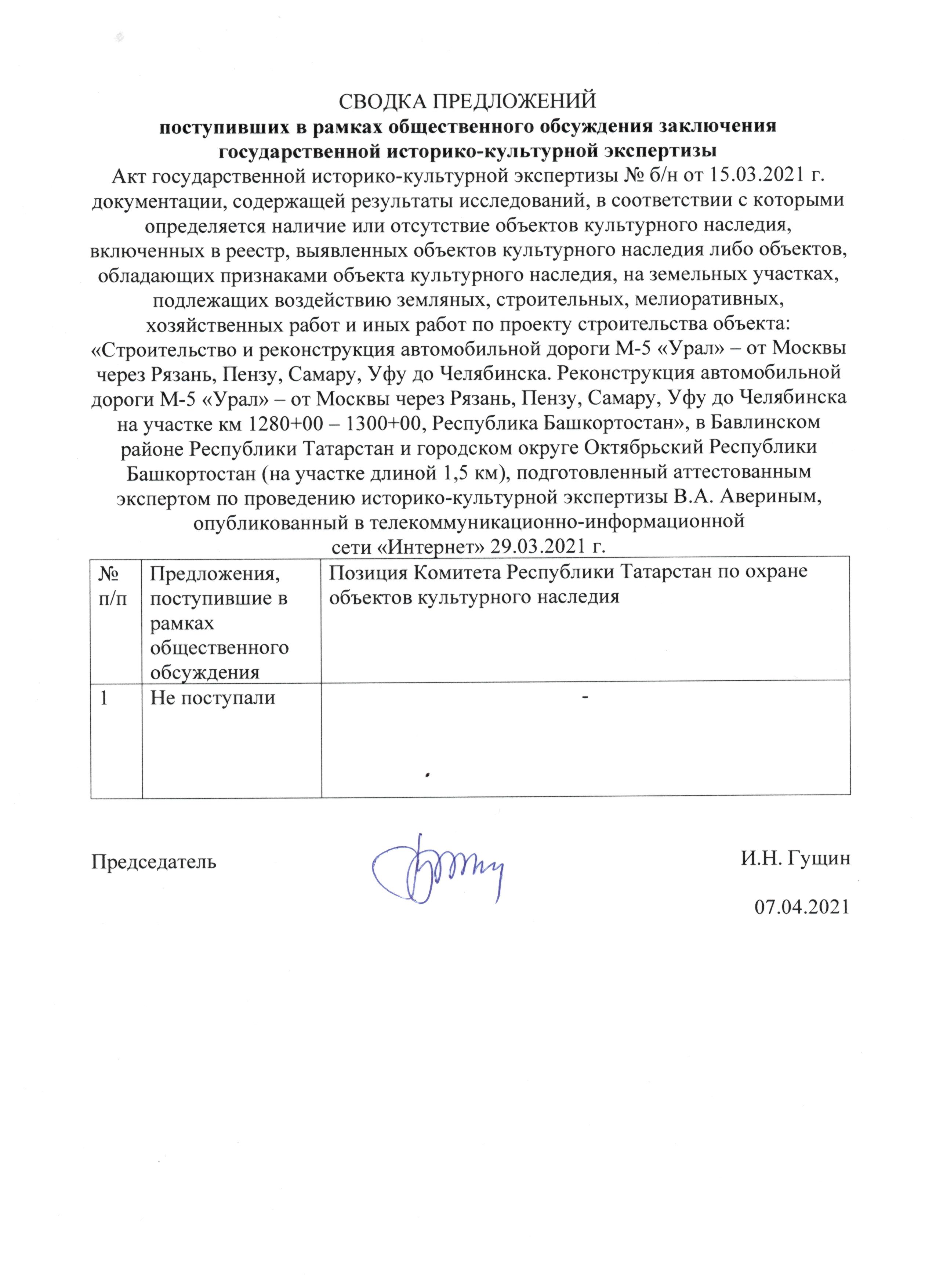 АКТ государственной историко-культурной экспертизы № б/н от 15.03.2021 г. документации, содержащей результаты исследований, в соответствии с которыми определяется наличие или отсутствие объектов культурного наследия, включенных в реестр, выявленных объектов культурного наследия либо объектов, обладающих признаками объекта культурного наследия, на земельных участках, подлежащих воздействию земляных, строительных, мелиоративных, хозяйственных работ и иных работ по проекту строительства объекта: «Строительство и реконструкция автомобильной дороги М-5 «Урал» – от Москвы через Ря-зань, Пензу, Самару, Уфу до Челябинска. Реконструкция автомобильной дороги М-5 «Урал» – от Москвы через Рязань, Пензу, Самару, Уфу до Челябинска на участке км 1280+00 – 1300+00, Республика Башкортостан», в Бавлинском районе Республики Татарстан и городском округе Октябрьский Республики Башкортостан (на участке длиной 1,5 км)