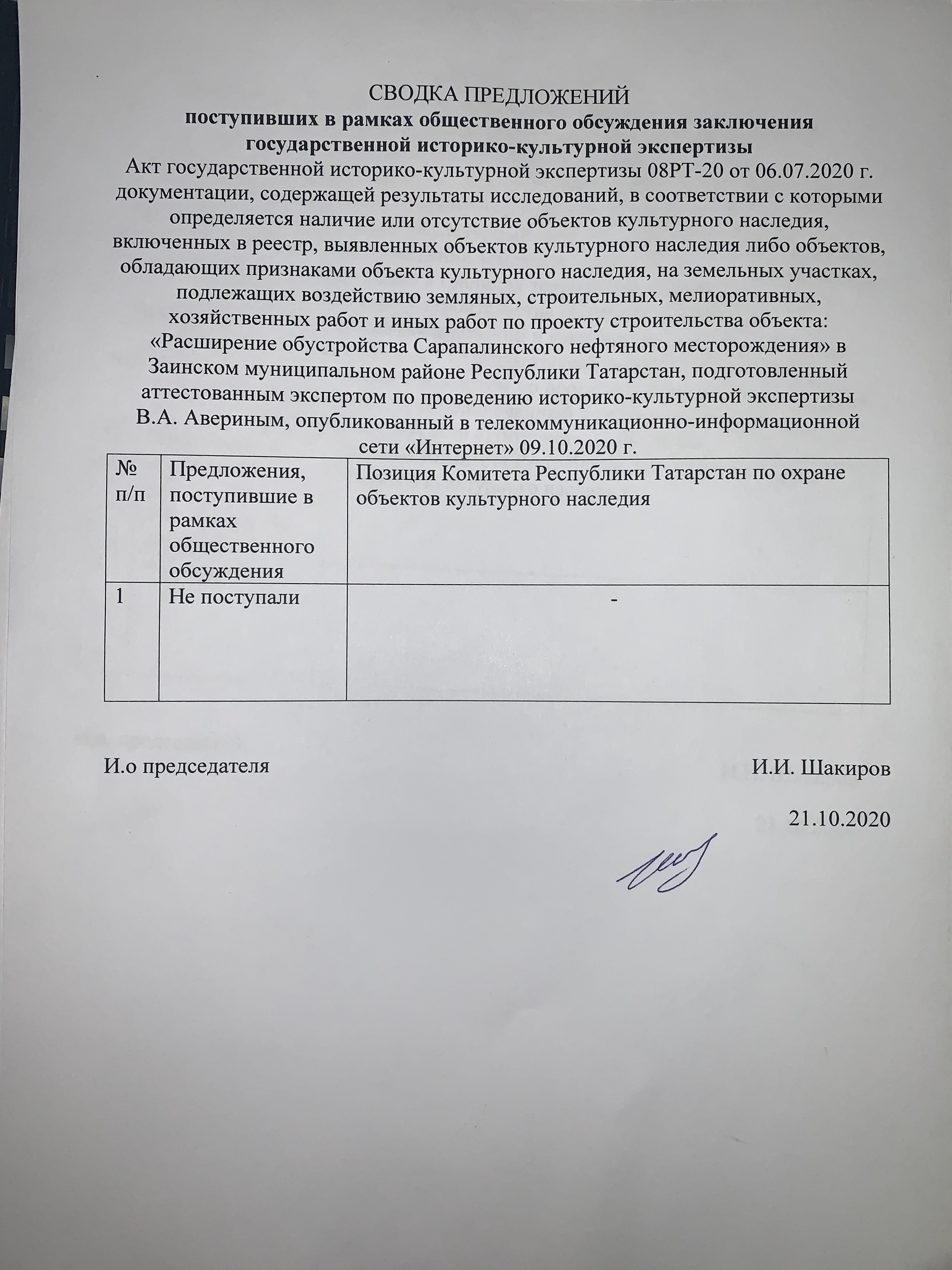 Акт государственной историко-культурной экспертизы документации, содержащей результаты исследований, в соответствии с которыми определяется наличие или отсутствие объектов культурного наследия, включенных в реестр, выявленных объектов культурного наследия либо объектов, обладающих признаками объекта культурного наследия, на земельных участках, подлежащих воздействию земляных, строительных, мелиоративных, хозяйственных работ и иных работ по проекту строительства объекта: «Расширение обустройства Сарапалинского нефтяного месторождения» в Заинском муниципальном районе Республики Татарстан