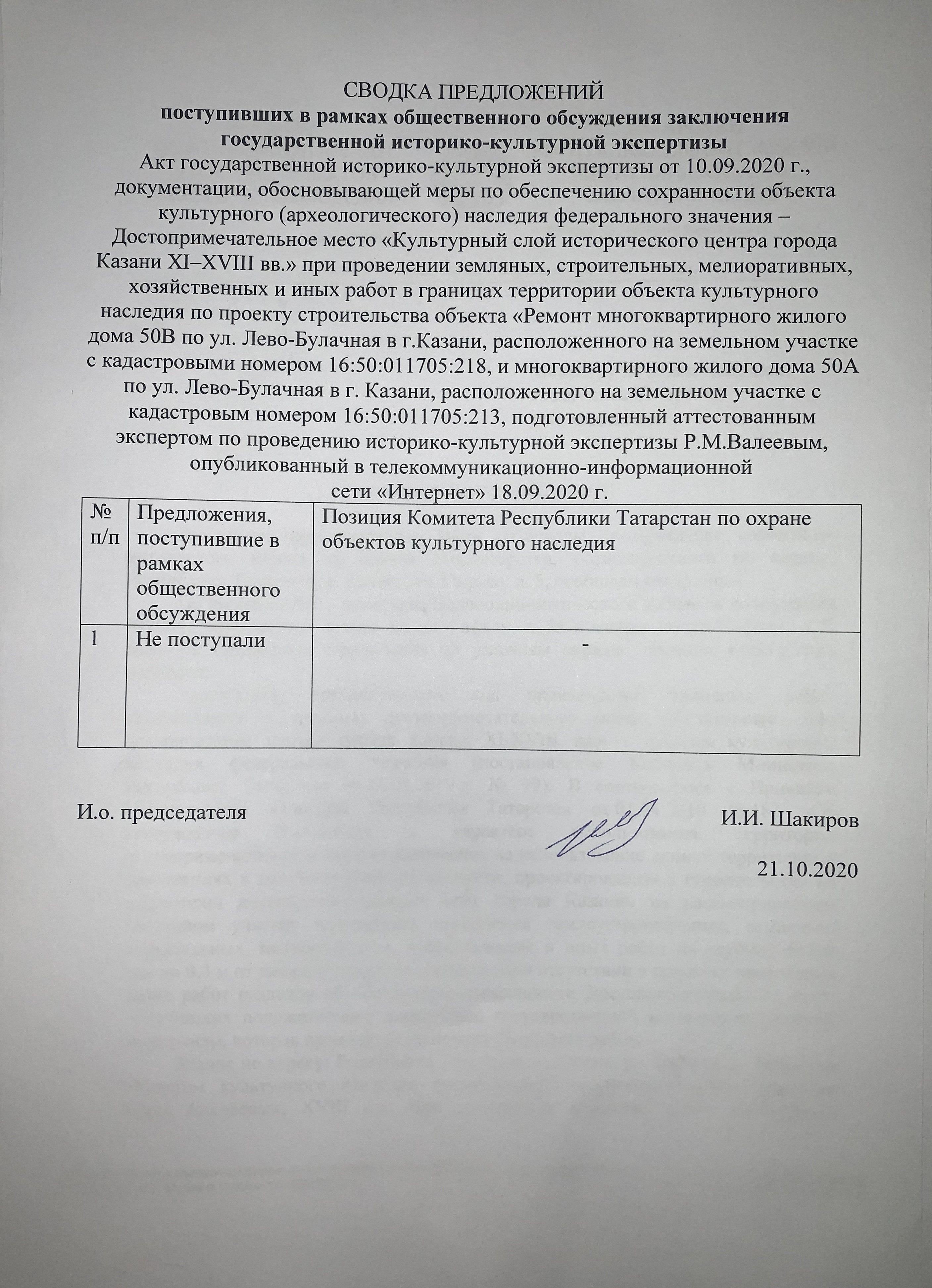 Акт государственной историко-культурной экспертизы документации, обосновывающей меры по обеспечению сохранности объекта культурного (археологического) наследия регионального (республиканского) значения – Достопримечательное место «Культурный слой исторического центра города Казани XI–XVIII вв.» при проведении земляных, строительных, мелиоративных, хозяйственных и иных работ в границах территории объекта культурного наследия по проекту строительства объекта «Ремонт многоквартирного жилого дома 50В по ул. Лево-Булачная в г.Казани, расположенного на земельном участке с кадастровыми номером 16:50:011705:218, и многоквартирного жилого дома 50А по ул. Лево-Булачная в г.Казани, расположенного на земельном участке с кадастровым номером 16:50:011705:213»
