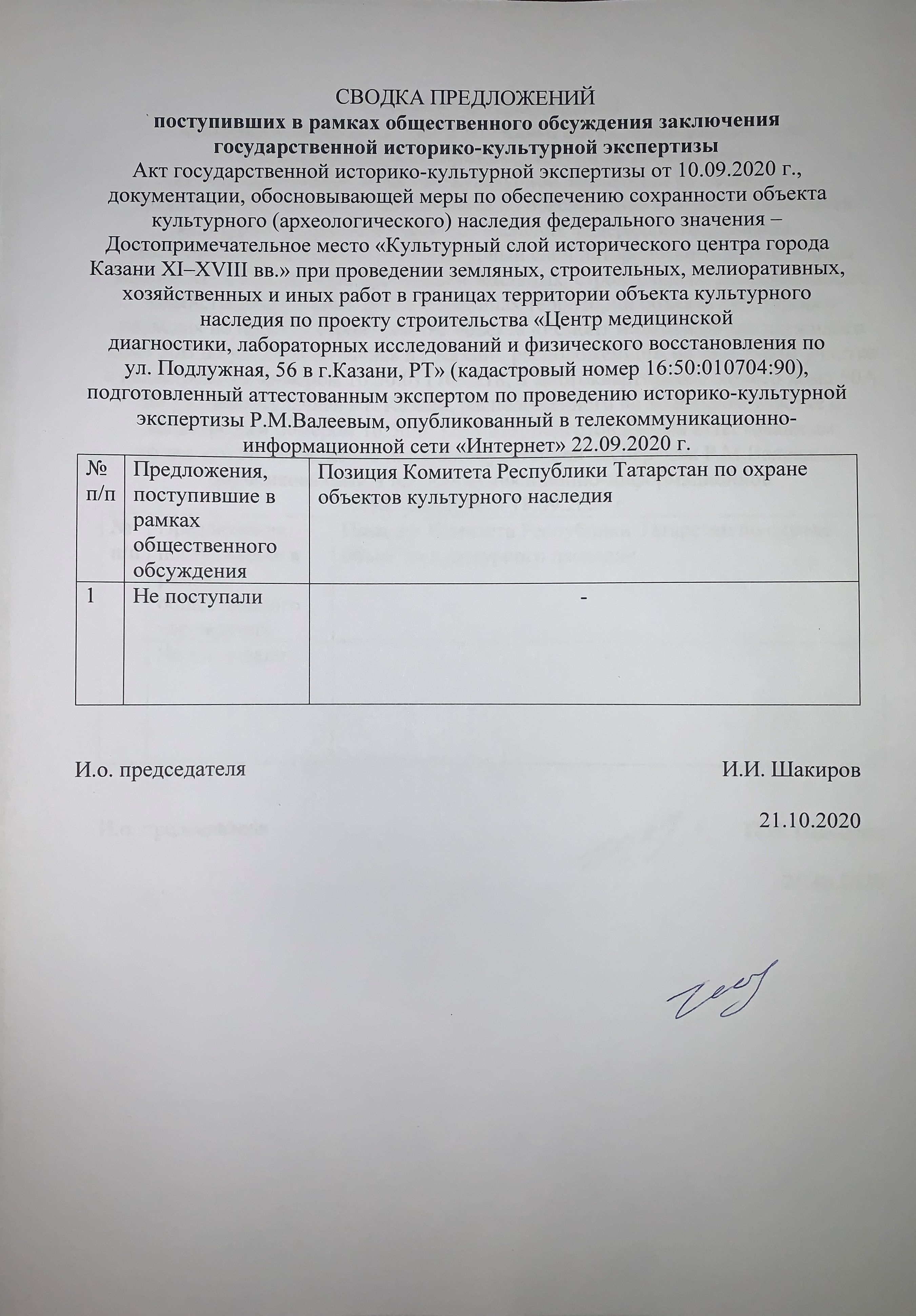 Акт государственной историко-культурной экспертизы документации, обосновывающей меры по обеспечению сохранности объекта культурного (археологического) наследия регионального (республиканского) значения – Достопримечательное место «Культурный слой исторического центра города Казани XI–XVIII вв.» при проведении земляных, строительных, мелиоративных, хозяйственных и иных работ в границах территории объекта культурного наследия по проекту строительства «Центр медицинской диагностики, лабораторных исследований и физического восстановления по ул. Подлужная, 56 в г.Казани, РТ» (кадастровый номер 16:50:010704:90)
