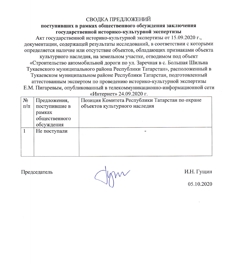 Акт государственной историко-культурной экспертизы Документации, содержащей результаты исследований, в соответствии, с которыми определяется наличие или отсутствие объектов, обладающих признаками объекта культурного наследия, на земельном участке, подлежащем воздействию земляных, строительных, мелиоративных и (или) хозяйственных работ, отводимом под объект «Строительство автомобильной дороги по ул. Заречная в с. Большая Шильна Тукаевского муниципального района Республики Татарстан»