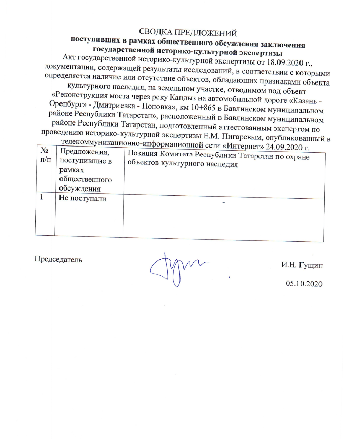 Акт государственной историко-культурной экспертизы Документации, содержащей результаты исследований, в соответствии, с которыми определяется наличие или отсутствие объектов, обладающих признаками объекта культурного наследия, на земельном участке, подлежащем воздействию земляных, строительных, мелиоративных и (или) хозяйственных работ, отводимом под объект «Реконструкция моста через реку Кандыз на автомобильной дороге «Казань - Оренбург» - Дмитриевка - Поповка», км 10+865 в Бавлинском муниципальном районе Республики Татарстан»