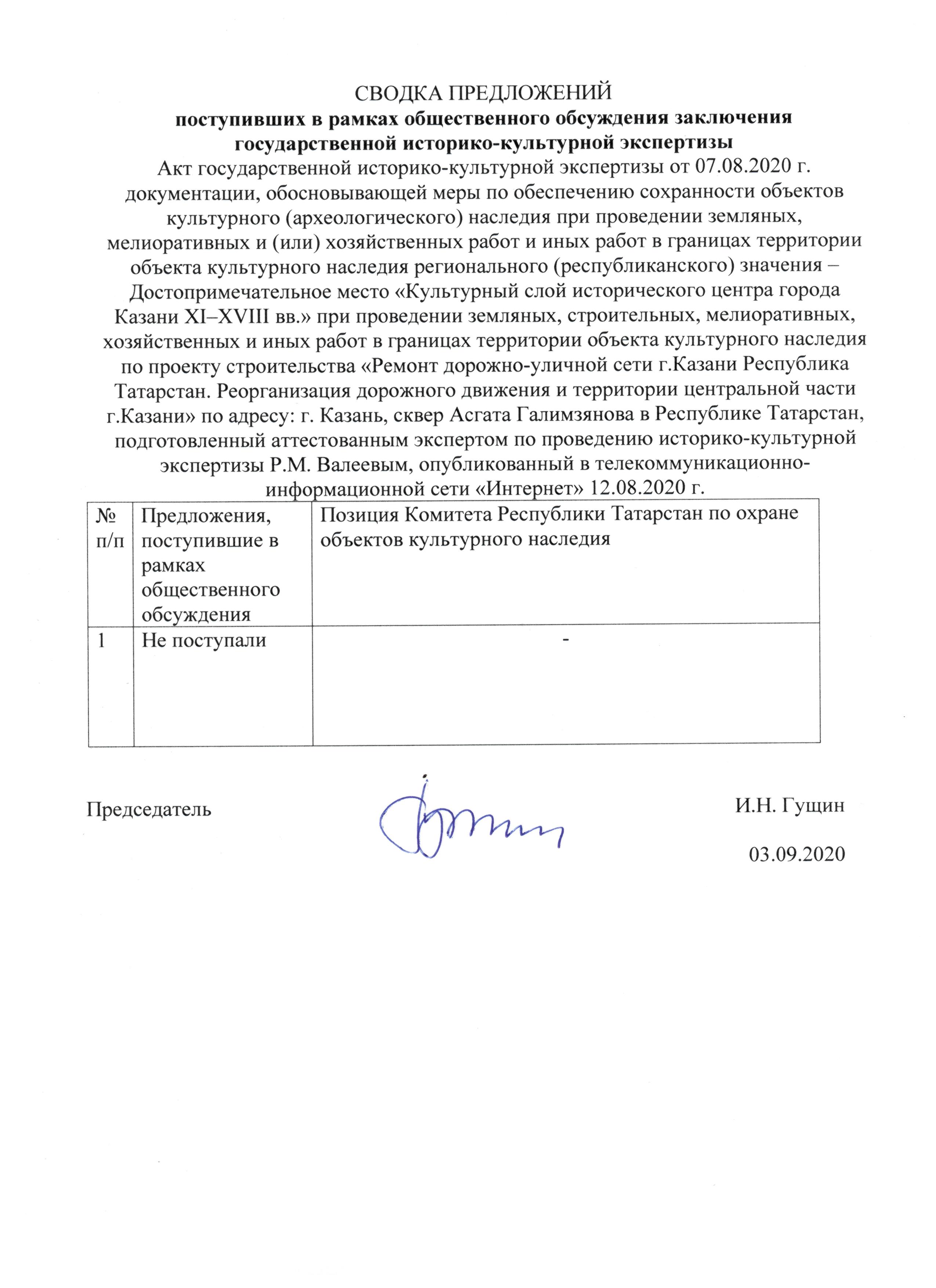 Акт государственной историко-культурной экспертизы документации, обосновывающей меры по обеспечению сохранности объекта культурного (археологического) наследия регионального (республиканского) значения – Достопримечательное место «Культурный слой исторического центра города Казани XI–XVIII вв.» при проведении земляных, мелиоративных и (или) хозяйственных работ и иных работ в границах территории объекта культурного наследия: по проекту строительства «Ремонт дорожно-уличной сети г.Казани Республика Татарстан. Реорганизация дорожного движения и территории центральной части г.Казани» по адресу: г. Казань, сквер Асгата Галимзянова
