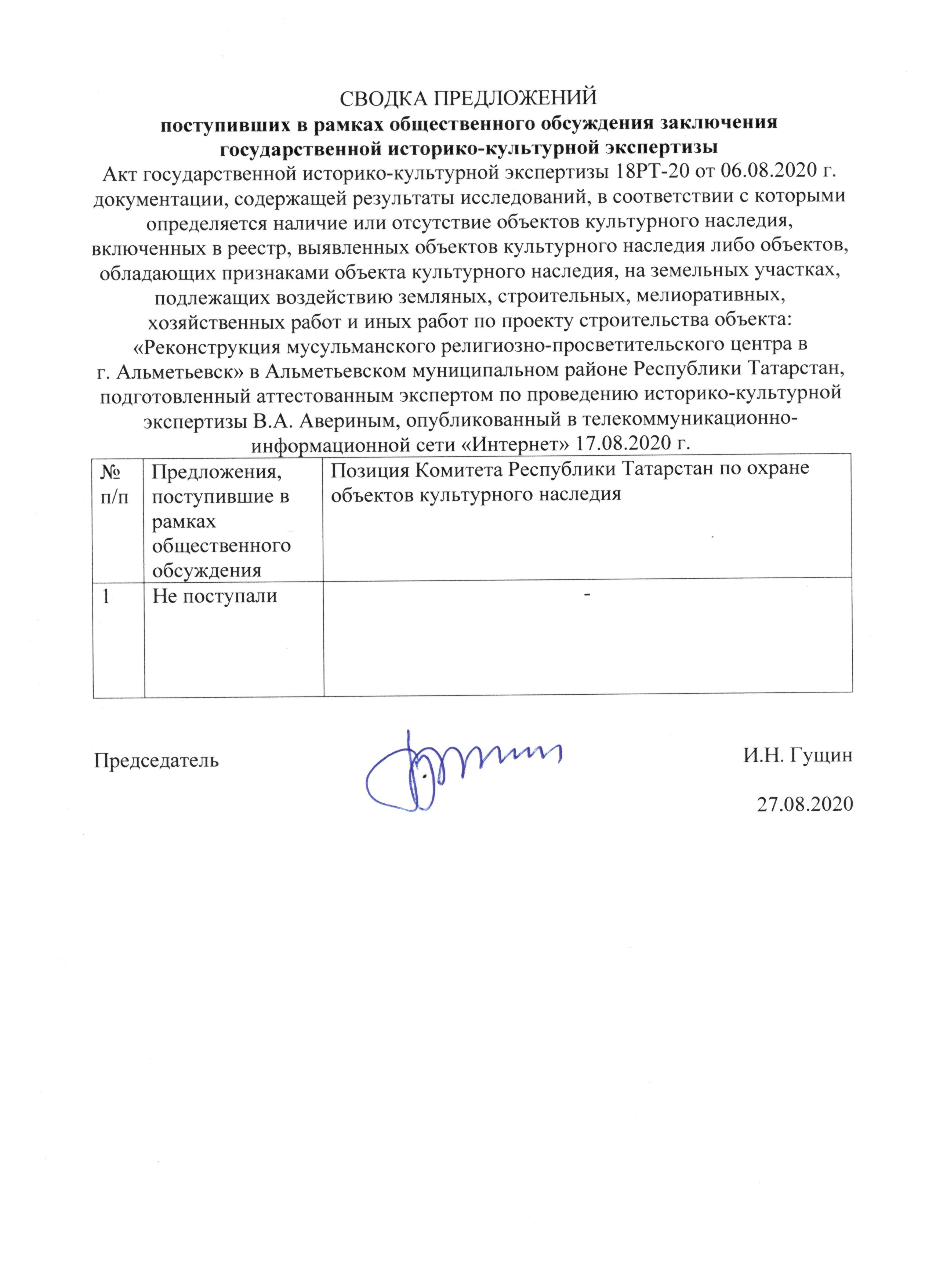 АКТ государственной историко-культурной экспертизы 18РТ-20 от 06. 08. 2020 г. документации, содержащей результаты исследований, в соответствии с которыми определяется наличие или отсутствие объектов культурного наследия, включенных в реестр, выявленных объектов культурного наследия либо объектов, обладающих признаками объекта культурного наследия, на земельных участках, подлежащих воздействию земляных, строительных, мелиоративных, хозяйственных работ и иных работ по проекту строительства объекта: «Реконструкция мусульманского религиозно-просветительского центра в г. Альметьевск» в Альметьевском муниципальном районе Республики Татарстан