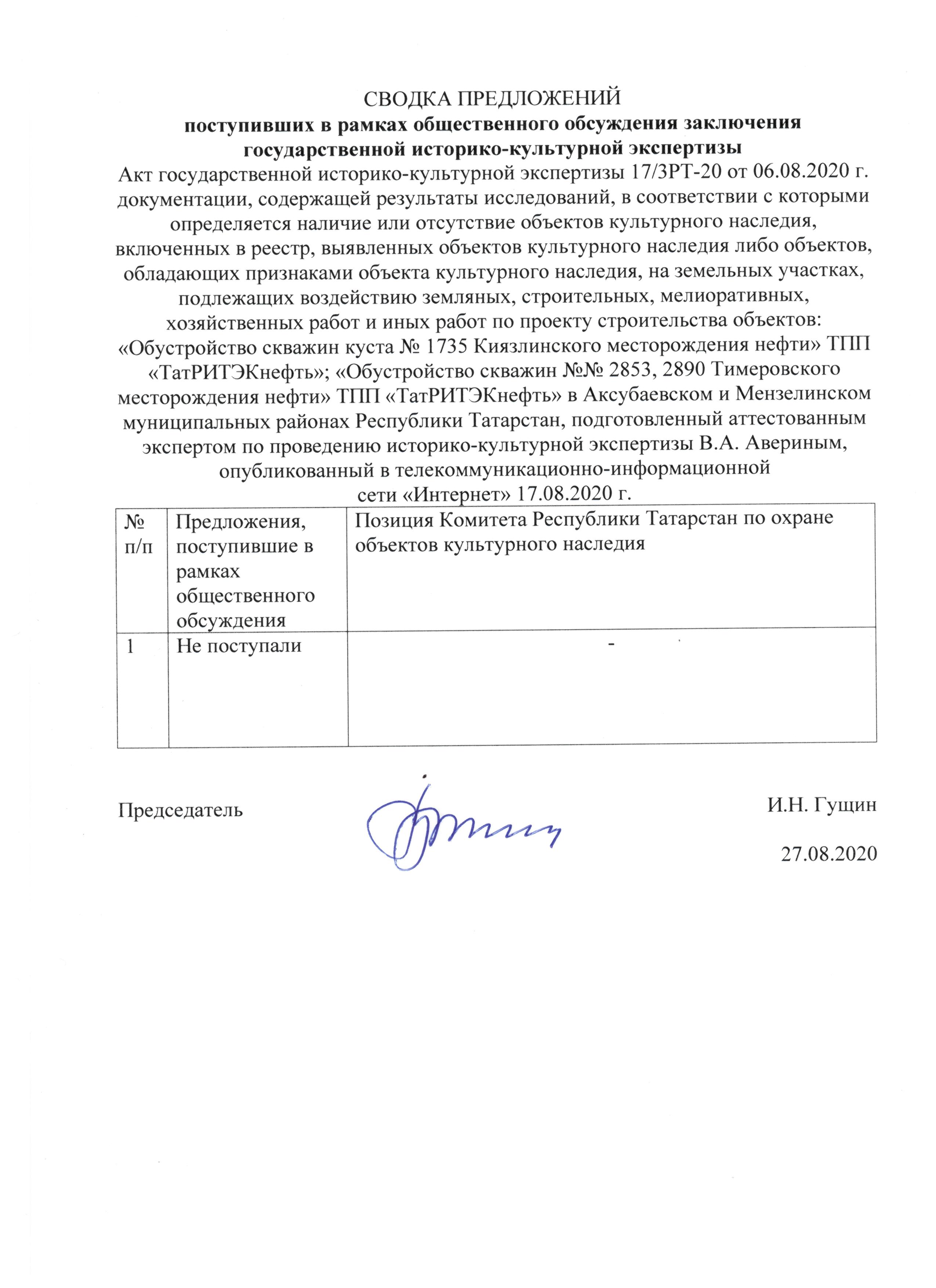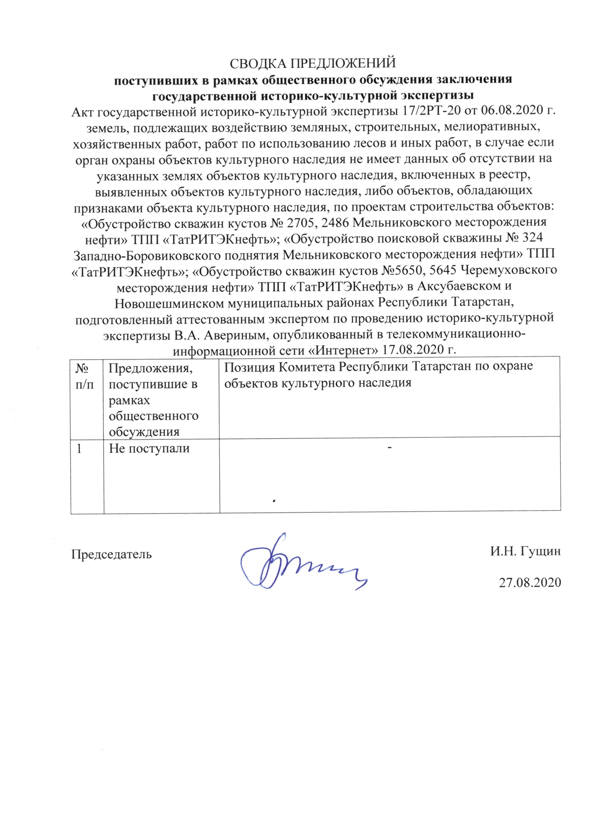 АКТ государственной историко-культурной экспертизы 17/2РТ-20 от 06. 08. 2020 г. земель, подлежащих воздействию земляных, строительных, мелиоративных, хозяйственных работ, работ по использованию лесов и иных работ, в случае если орган охраны объектов культурного наследия не имеет данных об отсутствии на указанных землях объектов культурного наследия, включенных в реестр, выявленных объектов культурного наследия, либо объектов, обладающих признаками объекта культурного наследия, по проектам строительства объектов: «Обустройство скважин кустов № 2705, 2486 Мельниковского месторождения нефти» ТПП «ТатРИТЭКнефть»; «Обустройство поисковой скважины № 324 Западно-Боровиковского поднятия Мельниковского месторождения нефти» ТПП «ТатРИТЭКнефть»; «Обустройство скважин кустов №5650, 5645 Черемуховского месторождения нефти» ТПП «ТатРИТЭКнефть» в Аксубаевском и Новошешминском муниципальных районах Республики Татарстан