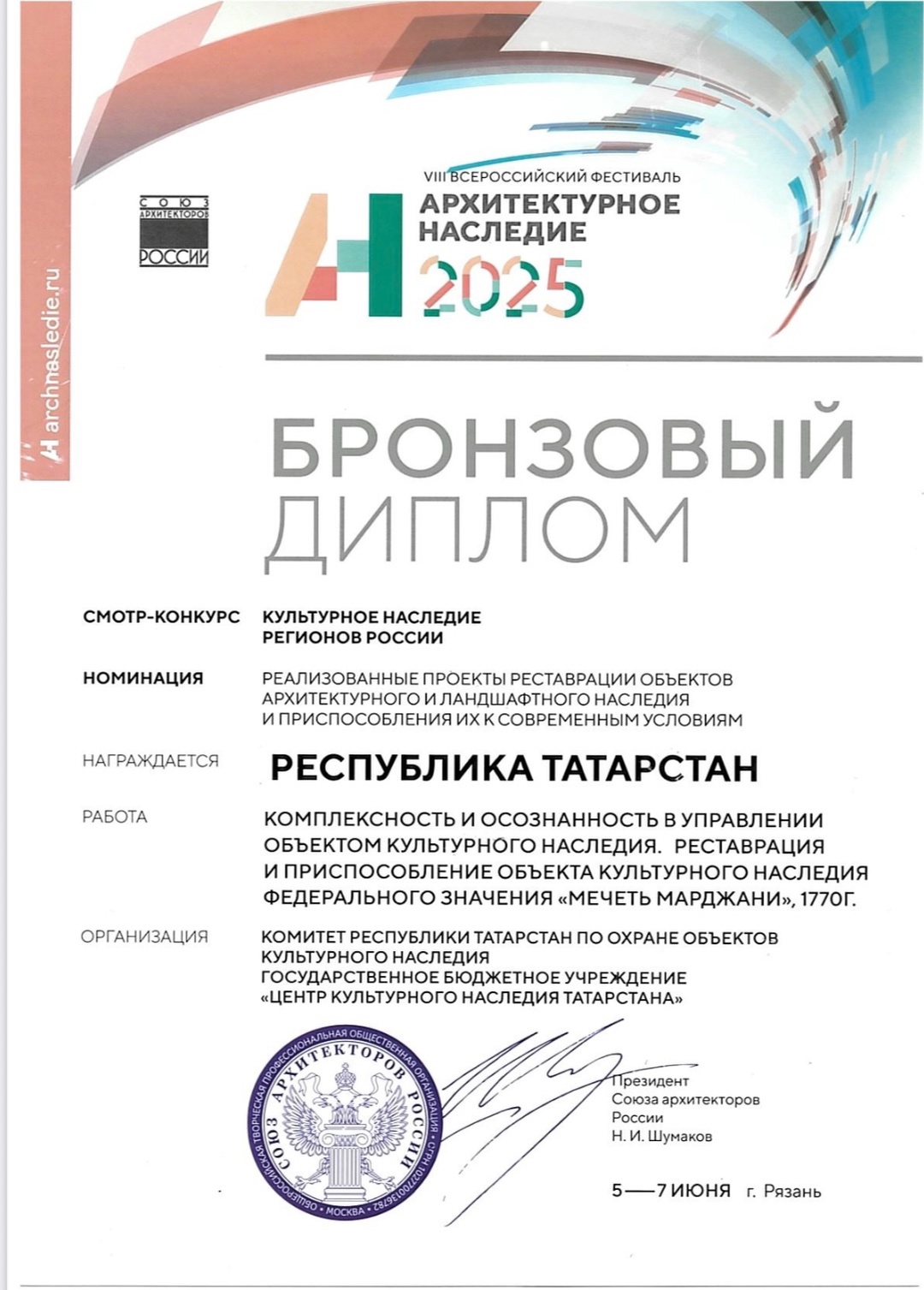 На VIII Всероссийском фестивале «Архитектурное наследие» в Рязани подвели итоги всероссийского конкурса «Культурное наследие регионов России». Татарстан получил Гран-при и Бронзовый диплом в конкурсе в номинации «Реализованные проекты реставрации объектов архитектурного и ландшафтного наследия и приспособления их к современным условиям». Татарстан был отмечен на федеральном уровне за выдающиеся достижения по реставрации исторических мечетей, в частности, отмечена работа по реставрации и приспособлению объекта культурного наследия федерального значения «Мечеть Марджани», 1770 г.
