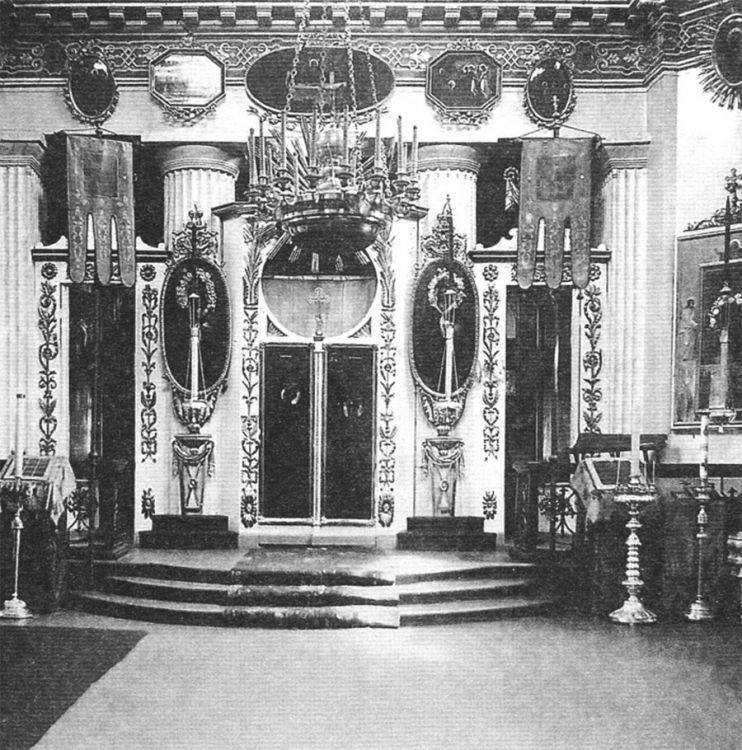 В верхней части снимка за иконами читается украшенный растительным орнаментом фриз, опоясывающий средокрестие храма. Роспись фриза была утрачена в советский период. Также заметно, что верхняя часть капителей колонн отличается по тону и скорее всего имела цвет. В 2014-2016 гг. специалистами Межобластного научно-реставрационного художественного управления (г. Москва) были росписаны купола и паруса храма. Интерьеры нижней части храма архитекторы-реставраторы Объединенной строительной компании (подрядная организация) оформлены в текущем году.