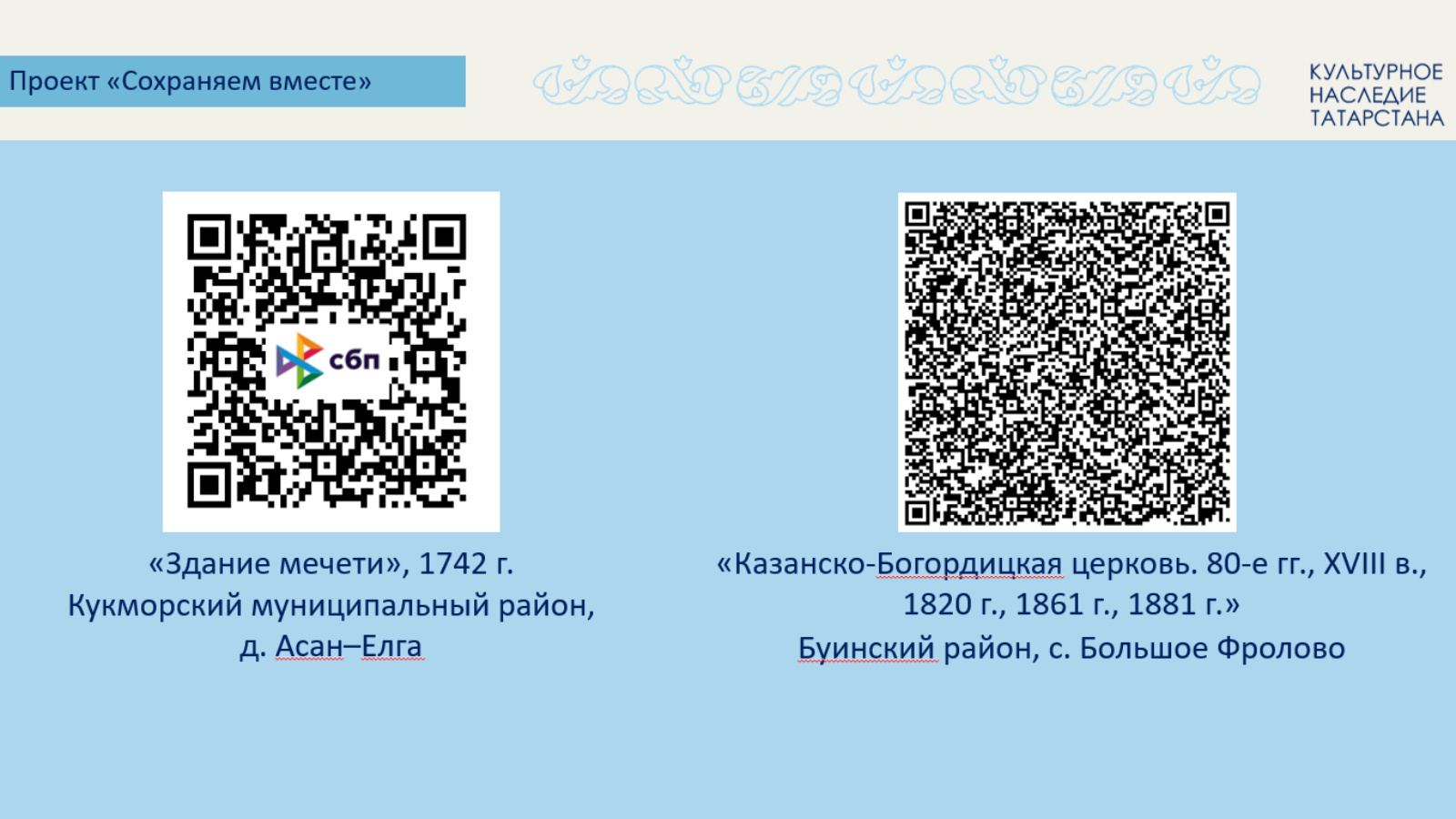 Проект «Сохраняем вместе» объединяет неравнодушных людей вокруг религиозных святынь республики и позволяет каждому жителю Татарстана внести личный вклад в сохранение наследия. На сайте Комитета размещены QR-коды со счетами мухтасиба мечети и прихода церкви. Пожертвования напрямую поступят на восстановление памятников деревянного зодчества.