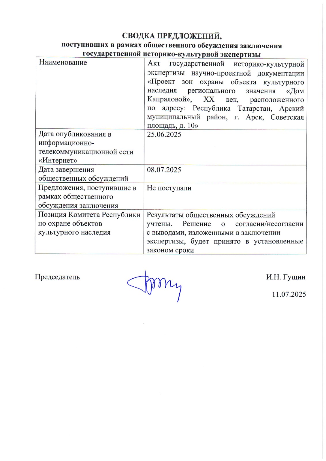АКТ государственной историко-культурной экспертизы научно-проектной документации «Проект зон охраны объекта культурного наследия регионального значения «Дом Капраловой», XX век, расположенного по адресу: Республика Татарстан, Арский муниципальный район, г. Арск, Советская площадь, д. 10»