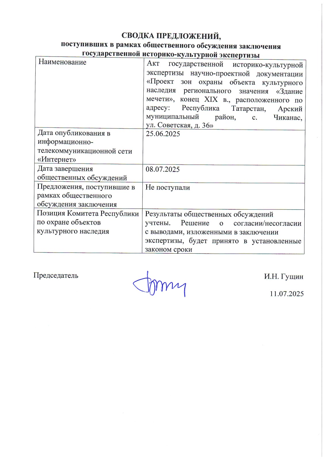 АКТ государственной историко-культурной экспертизы научно-проектной документации «Проект зон охраны объекта культурного наследия регионального значения «Здание мечети», конец XIX в., расположенного по адресу: Республика Татарстан, Арский муниципальный район, с. Чиканас, ул. Советская, д. 36»