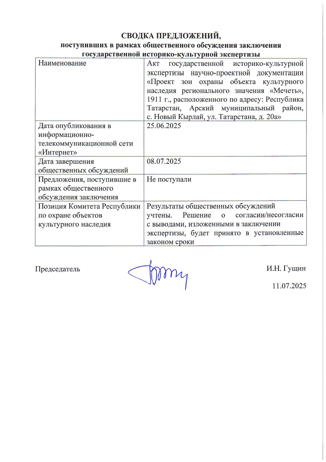 АКТ государственной историко-культурной экспертизы научно-проектной документации «Проект зон охраны объекта культурного наследия регионального значения «Мечеть», 1911 г., расположенного по адресу: Республика Татарстан, Арский муниципальный район, с. Новый Кырлай, ул. Татарстана, д. 20а»