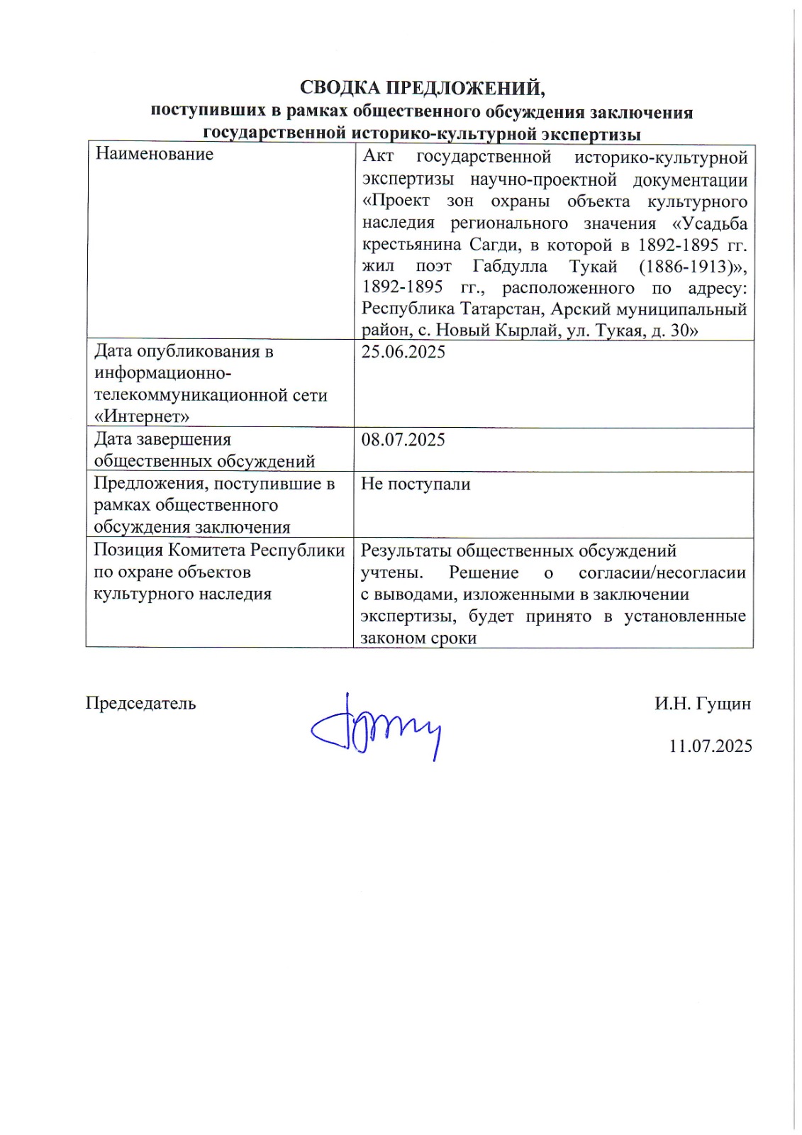 АКТ государственной историко-культурной экспертизы научно-проектной документации «Проект зон охраны объекта культурного наследия регионального значения «Усадьба крестьянина Сагди, в которой в 1892-1895 г.г. жил поэт Габдулла Тукай (1886-1913)», 1892-1895 гг., расположенного по адресу: Республика Татарстан, Арский муниципальный район, с. Новый Кырлай, ул. Тукая, д. 30»