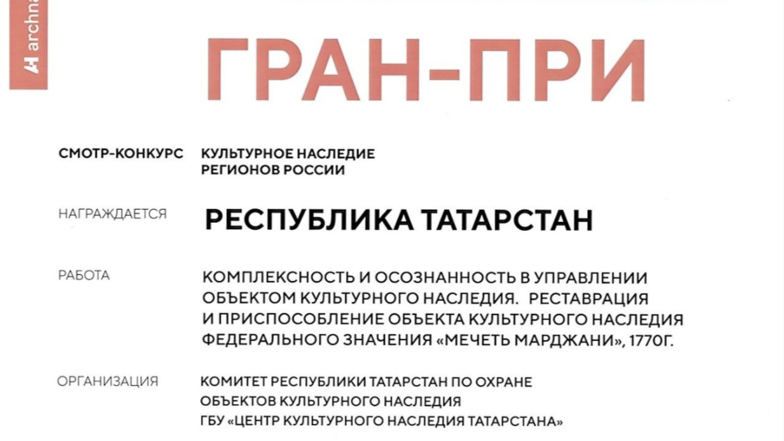 Рязаньда «Архитектура мирасы» VIII Бөтенроссия фестивалендә «Россия төбәкләренең мәдәни мирасы» Бөтенроссия конкурсына йомгак ясалды. Татарстан конкурста «Архитектура һәм ландшафт мирасы объектларын реставрацияләүнең һәм аларны заманча шартларга җайлаштыруның гамәлгә ашырылган проектлары» номинациясендә Гран-при һәм бронза диплом алды. Татарстан Тарихи мәчетләрне реставрацияләү буенча зур казанышлары өчен федераль дәрәҗәдә билгеләп үтелде, аерым алганда, федераль әһәмияттәге «Мәрҗани мәчете», 1770 ел мәдәни мирас объектын реставрацияләү һәм җайлаштыру эше билгеләп үтелде.